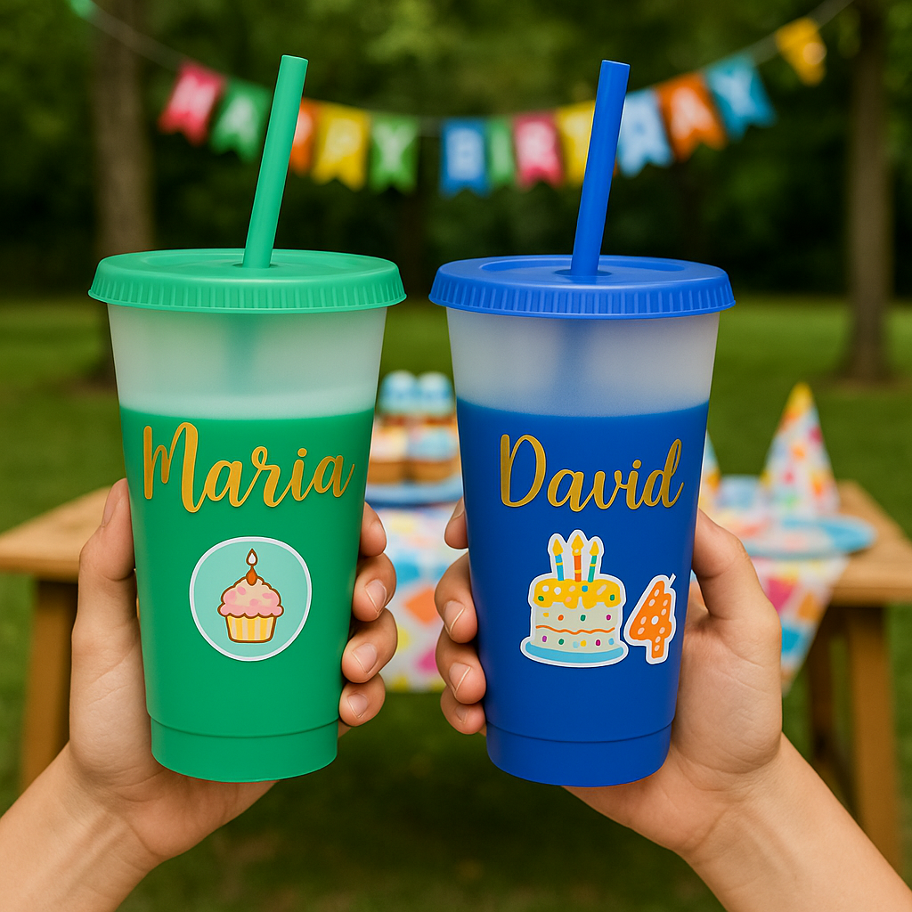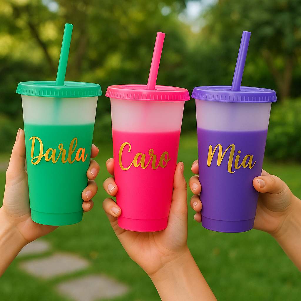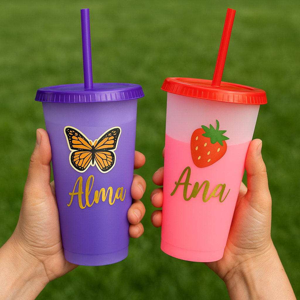 Personaliza este vaso mágico de 24oz que cambia de color al contacto con agua fría. ¡Un detalle único que combina diversión y estilo con tu nombre, frase o diseño especial en vinil de corte o sticker!